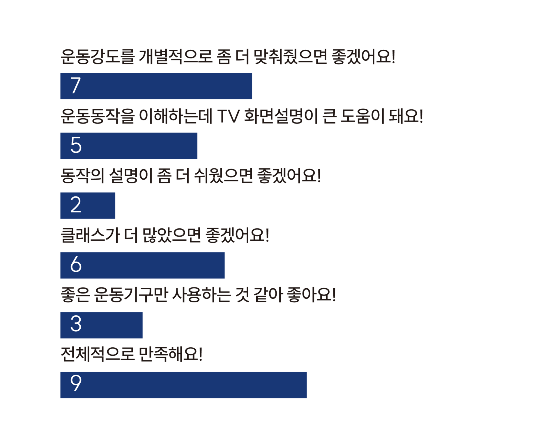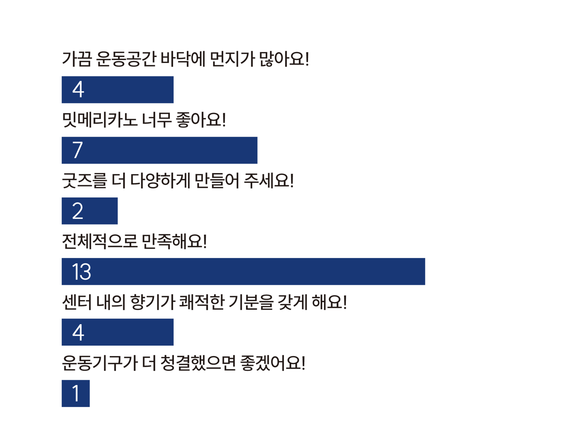 밋터들이 더 활기차고 재밌게 운동할 수 있도록 그룹 워크아웃 동작들이 더 많아졌음 좋겠습니다! 그리고 월 1회 정도는 회원들이 동작을 어느 정도 숙지하고 잘 따라하고 있는지 모니터데이(?)를 신설해 시범 운영해 보는 건 어떨지 건의드입니다. 모니터라함은 영상 촬영이 되겠죠? ^^