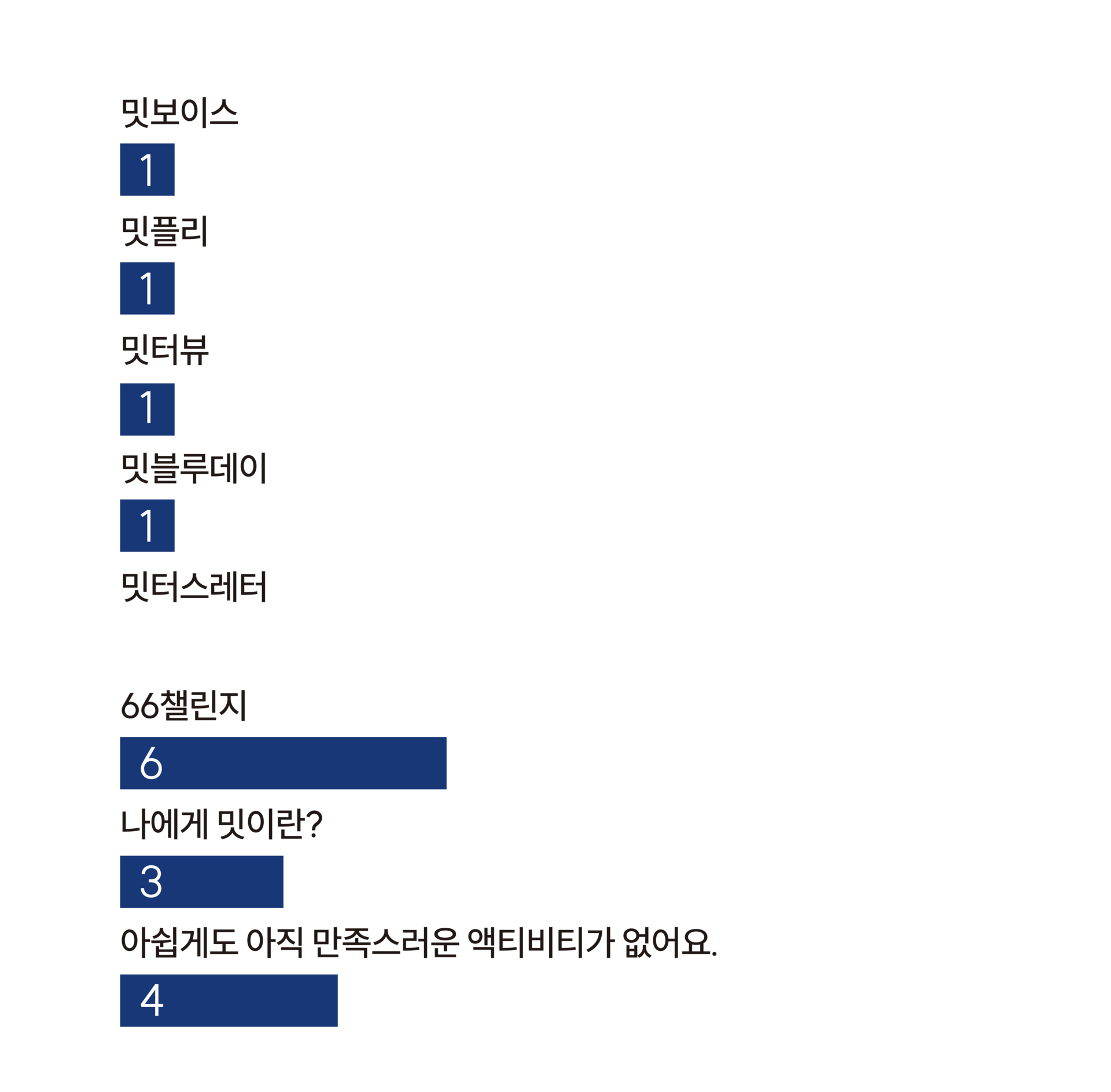 밋터들의 더 즐거운 운동환경을 위하여 여러가지 액티비티 혹은 이벤트를 기획하도록 할게요!