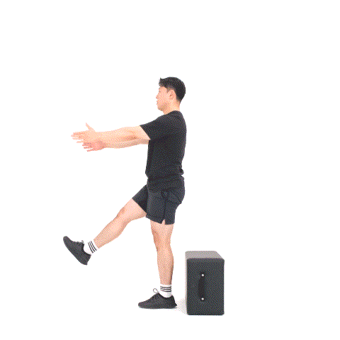 박스에 앉아 한 다리 뻗고, 반대 다리 발바닥 전체로