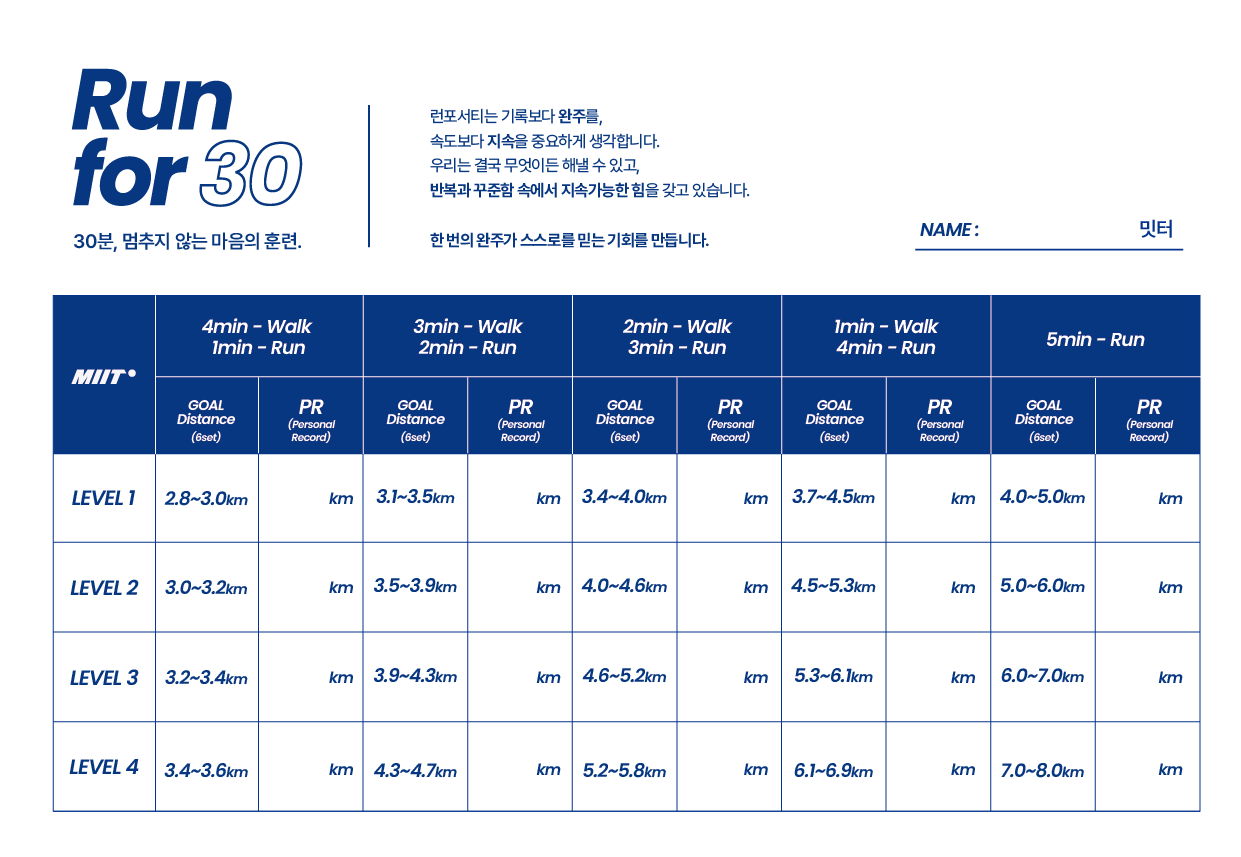 점점 달리기 비중을 늘려나가며 나의 레벨업을 확인하다보면, 30분을 쉬지않고 완주하는 성취감을 느낄 수 있을거에요!