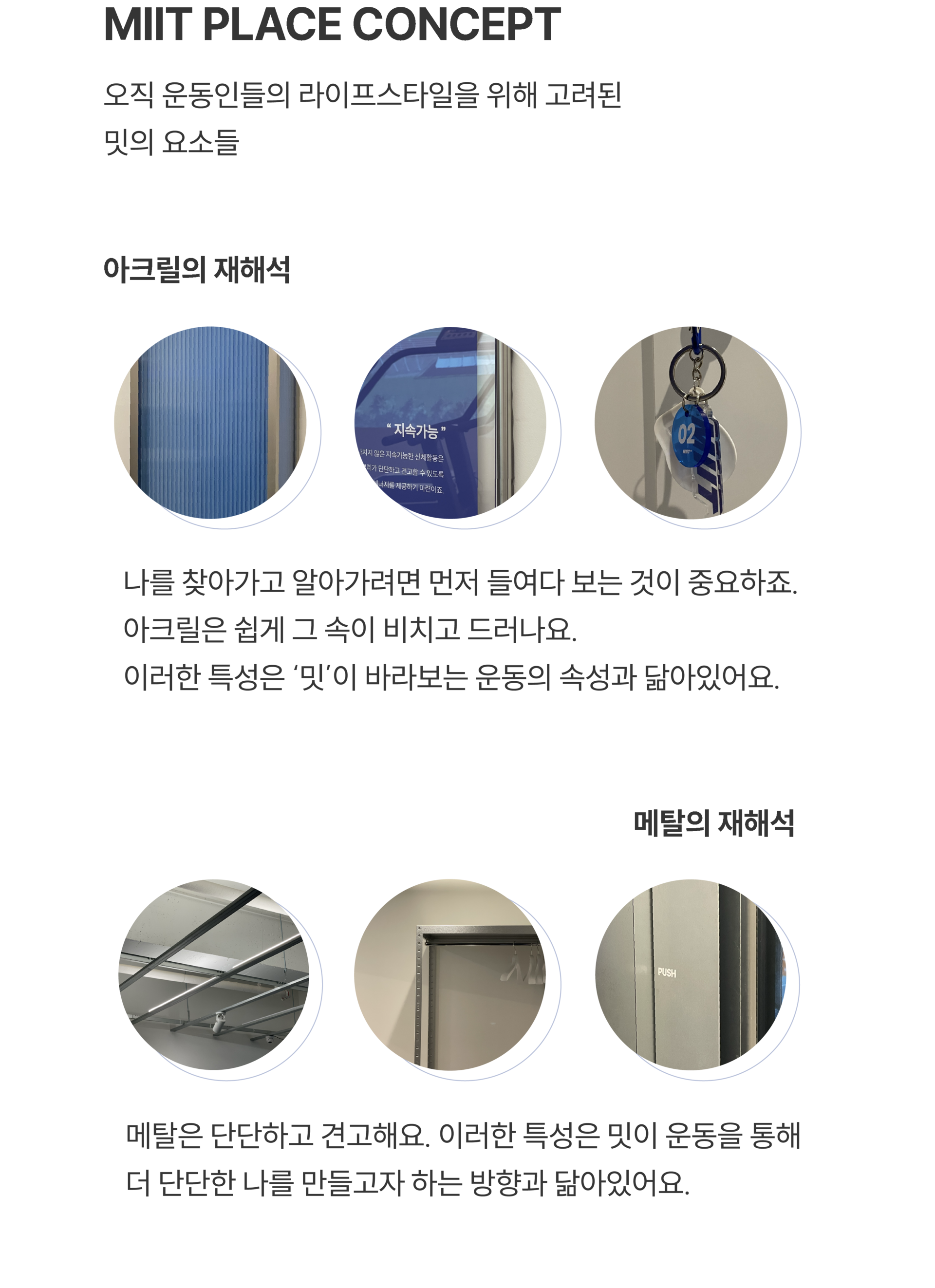 그 끝의 원형은 운동 정착지로서의 마침표, 그리고 밋터들의 움직임이 담겨있어요.